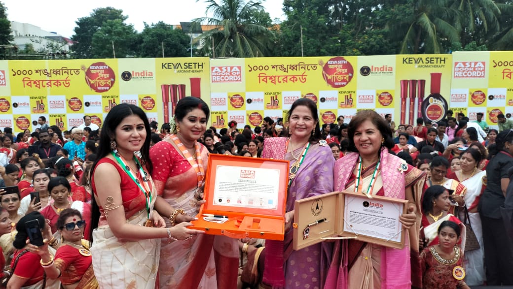 History was created this Mahalaya as Keya Seth Alta Sindoor “Shaktir Aradhona” made it to the Asia Book of Records and the India Book of Records. At the iconic Deshapriya Park Durgotsab, 672 women draped in traditional laap paar sada saree, adorned with alta and sindoor gathered to welcome Devi Paksha, filling the air with the thunderous sound of 672 Sankhas (conch shells) blown together, a feat never achieved before.